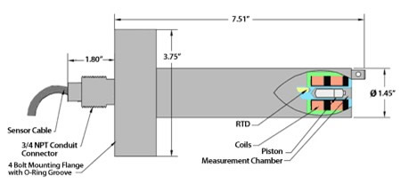 續電磁力的作用下來回移動一個微型活塞。專利技術的電路分析活塞來回移動行程的時間,從而測量絕對粘度。 一個內置的RTD溫度測量探頭,實時測量測量室的溫度。